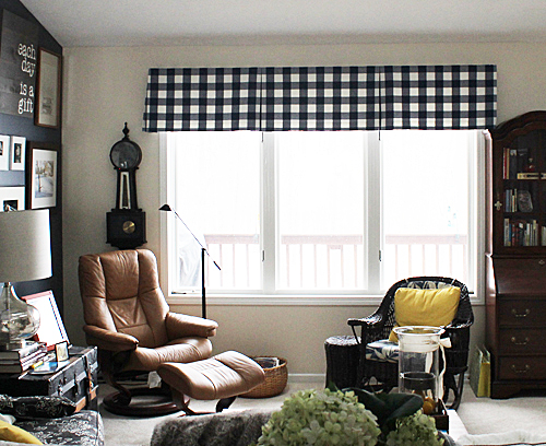 Such an inviting room. Love the checks in the valance. I can see myself sitting in that comfy chair looking out the window and knitting.