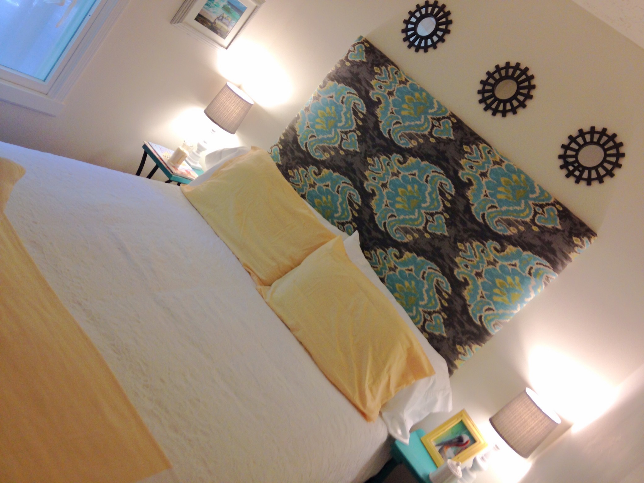 In February we purchased a small ranch style vacation home just outside of Ocean City, MD. I have had a fun time shopping all the bargain places like Marshall’s, Home Goods, thrift stores, yard sales and reusing some furniture we already had. For the guest room, I chose a turquoise, butter yellow and gray palette. We used a queen bed frame and mattress from Ikea that we already had. I found a wooden side table for a dollar at a yard sale and painted it turquoise and distressed it. The base has a trestle shape. I found a wooden topped metal base table at Marshall’s and painted the top in a matching turquoise but left the metal base as is. I got the matelasse duvet cover at a local antiques store and bought some new sheets, bed pillows and a butter yellow table runner is laid at the end of the bed to add a unifying pop of yellow at the bottom. I found the two table lamps with white bases and gray shades at Target. There is a butter yellow frame with a pelican photo I took in Islamorada. There are various prints from the Internet hanging on the walls. The 3 mirror set came from Marshall’s in the perfect gray color. Best of all, I made the padded headboard myself! I fell in love with the oversize ikat fabric online and it is the focal point of the room. Very happy with how it came out!
