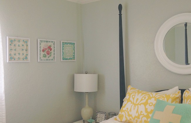 Oooh, though I love my bedroom, can I stay in your bedroom for a while? Just lovely. Nice paint job and I am glad you decided to keep your aunt’s furniture because they have good “bones” in them. Now furnitures are not real wood all the times. The bedroom looks pretty complete to me, but will be fabulous once you decide it is complete I am sure. I love the framed hankies…so vintage style.