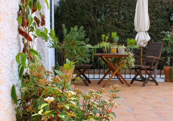 Las florecitas blancas del Viburnum tinus nos dan la bienvenida al llegar a casa, está plantado junto a la puerta de entrada junto a una Clematis montana todavía joven y un rosal Pierre de Ronsard que no se aprecia en la imagen pero está :-)
