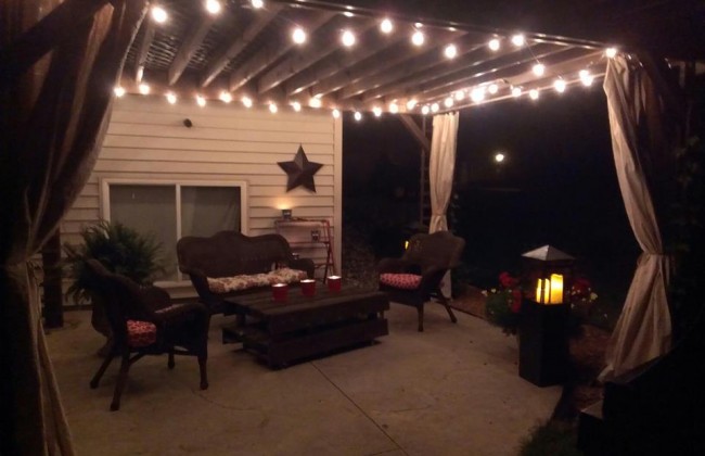 After begging my husband for years to build me a pergola over our patio, 2 years ago he finally relented and did it. I immediately went to work making it pretty by making curtains, adding new cushions and other touches. We were pretty happy with the addition of a $100 Craigslist fireplace find