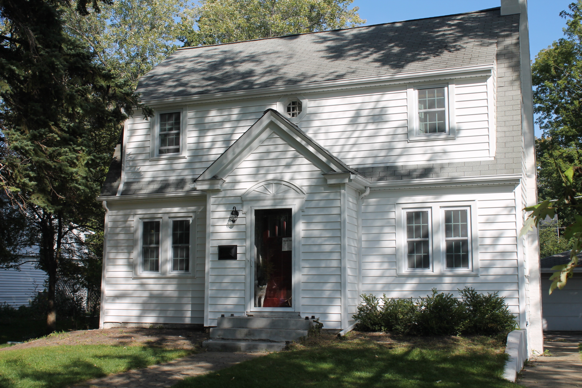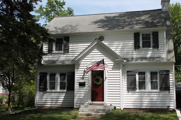 Adorable house! And I love the shutters and choice to go gray. I see a light blue door. Or maybe yellow 🙂