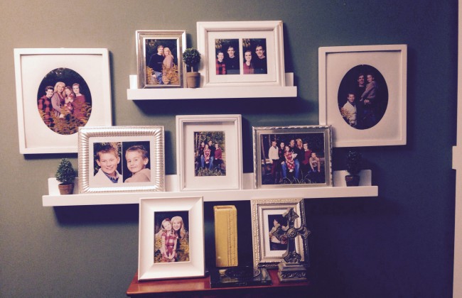 Recently I created a gallery wall of family and installed it in our entryway. This is important for us as we continue to blend two home into one and I love the sense of family portrayed here. This photo is how it looked after my 10-year-old guy finished dusting for me, so it’s not exactly perfect and there is a DVD on the stand, but it’s fairly noramal for us.