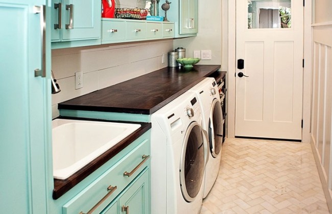 The good thing about a small area is if you aren’t in love with it, you can always paint it back. Of course, that’s a pain in the rump for me because I don’t like to redo painted cabinets if that is what you are thinking to paint. But, if you aren’t sure how you feel, how about a turquoise and white laundry room but use white paint for any cabinetry and then accents of turquoise (fabric, frames, or even the wall). With that said, that laundry room is adorable!